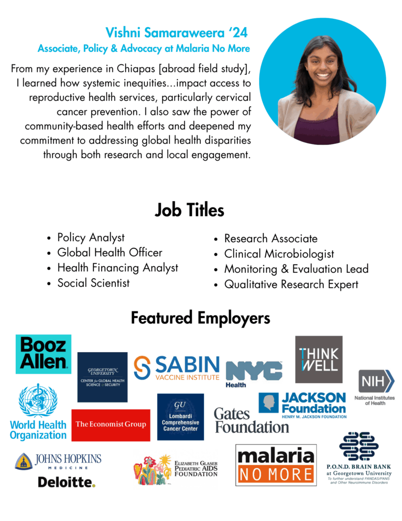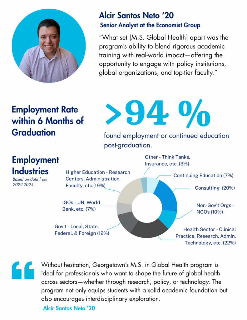 M.S. Global Health students emerge from our program with the necessary skills for positions in global health and development in areas such as health financing, managing health systems and health policy with a of goal of enhancing the health status of the world’s underserved populations.